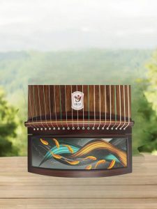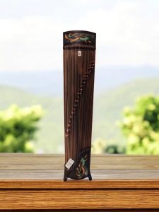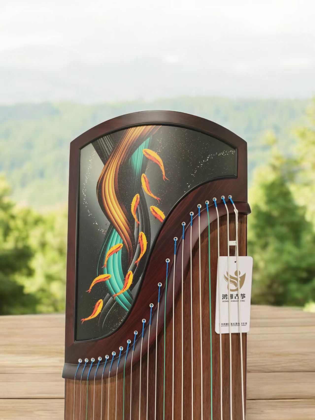 产品介绍:彩绘绢画类仿紫檀木贴面古筝是一款高品质学习古筝,筝名虚伫,愿存虚惊之心聆听古筝的妙音,而非仅伫立于欣赏“力争上游”彩绘九鲤图。